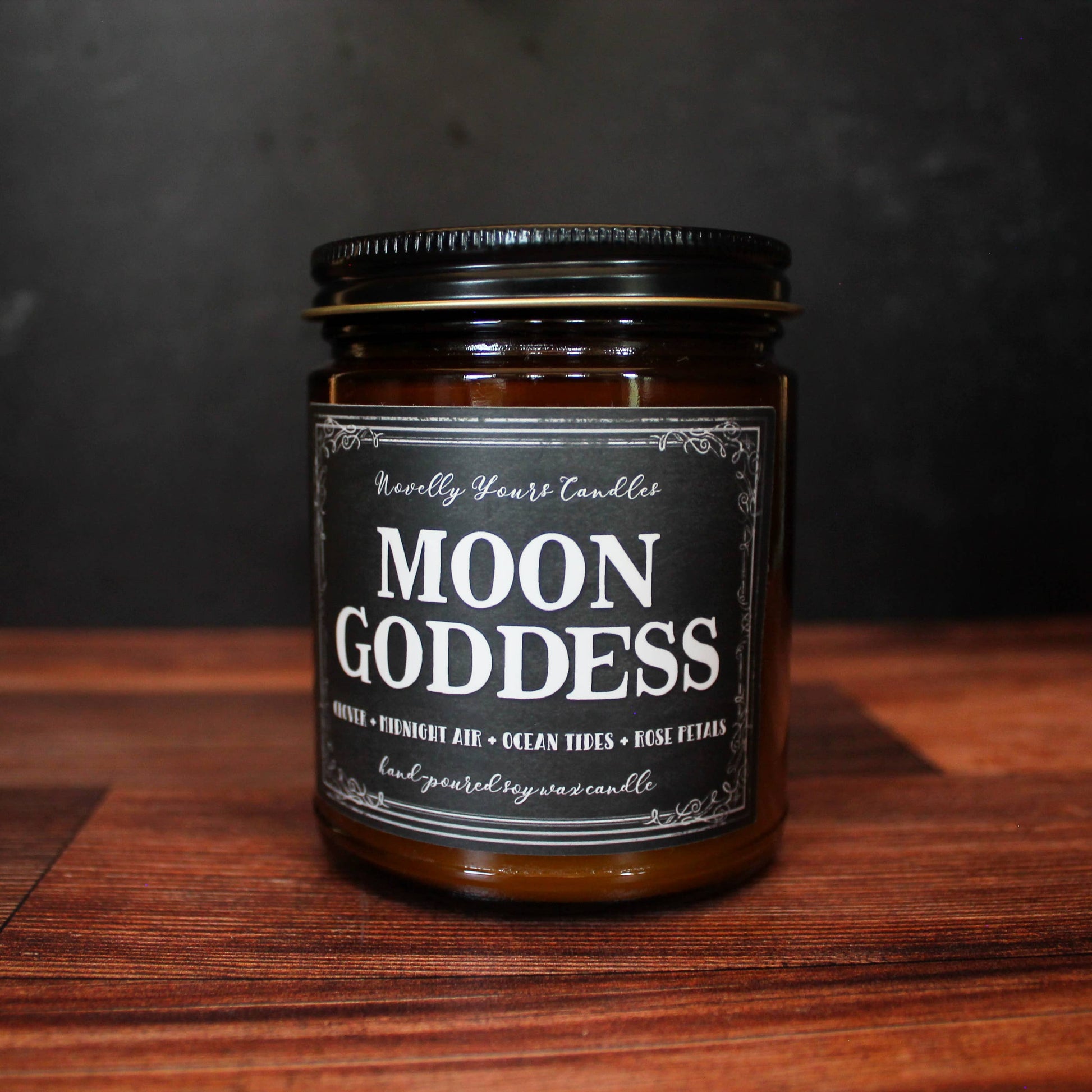 Part of the Novelly Yours enigmatic aromas candle collection, this 9 oz. Moon Goddess candle mixes atmospheric ocean aromas with fragrances of clover, midnight air, ocean tides, and rose petals.