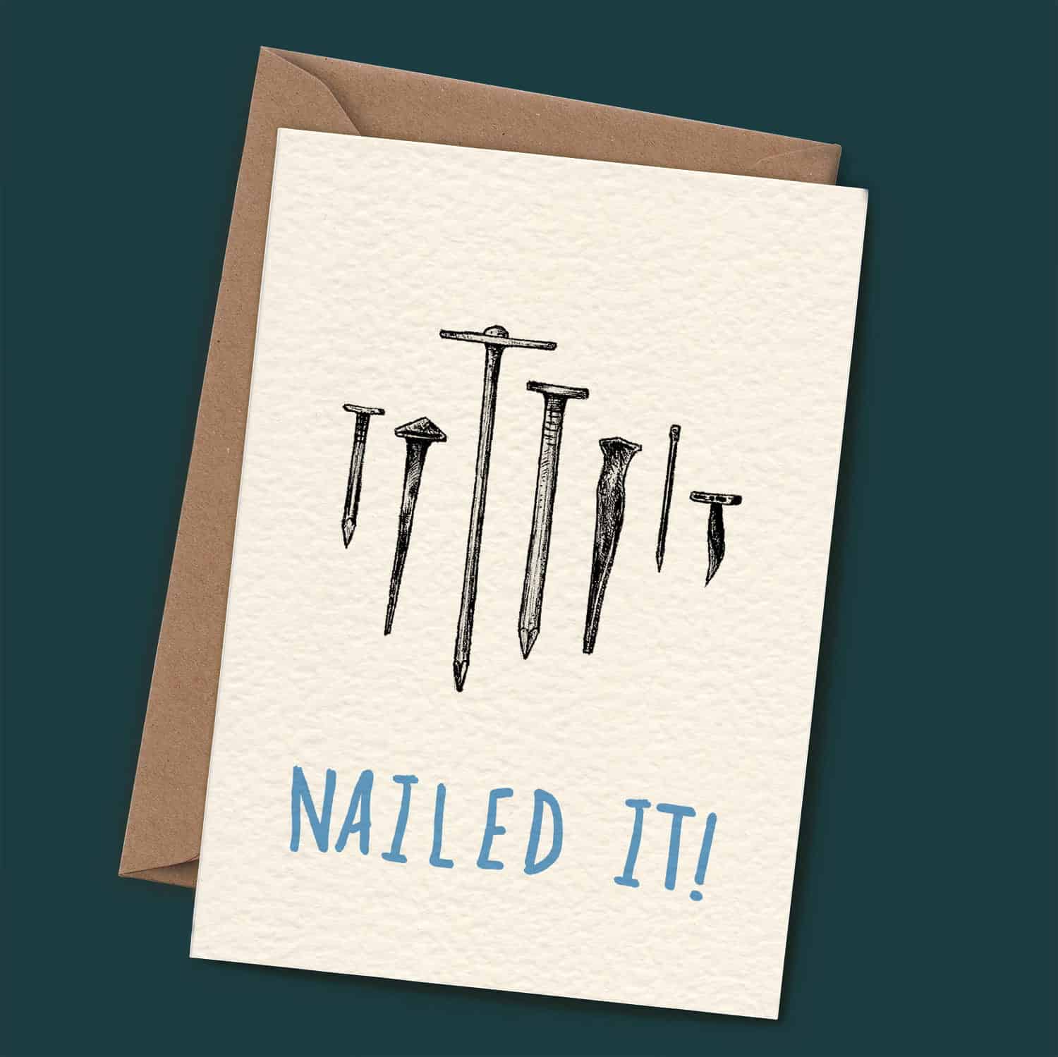 Nailed it! Could mean congratulations. Could mean thank you. Or, maybe your friend is a contestant on that game show. In any of these scenarios, this card is ideal to send to someone when they have absolutely nailed it!